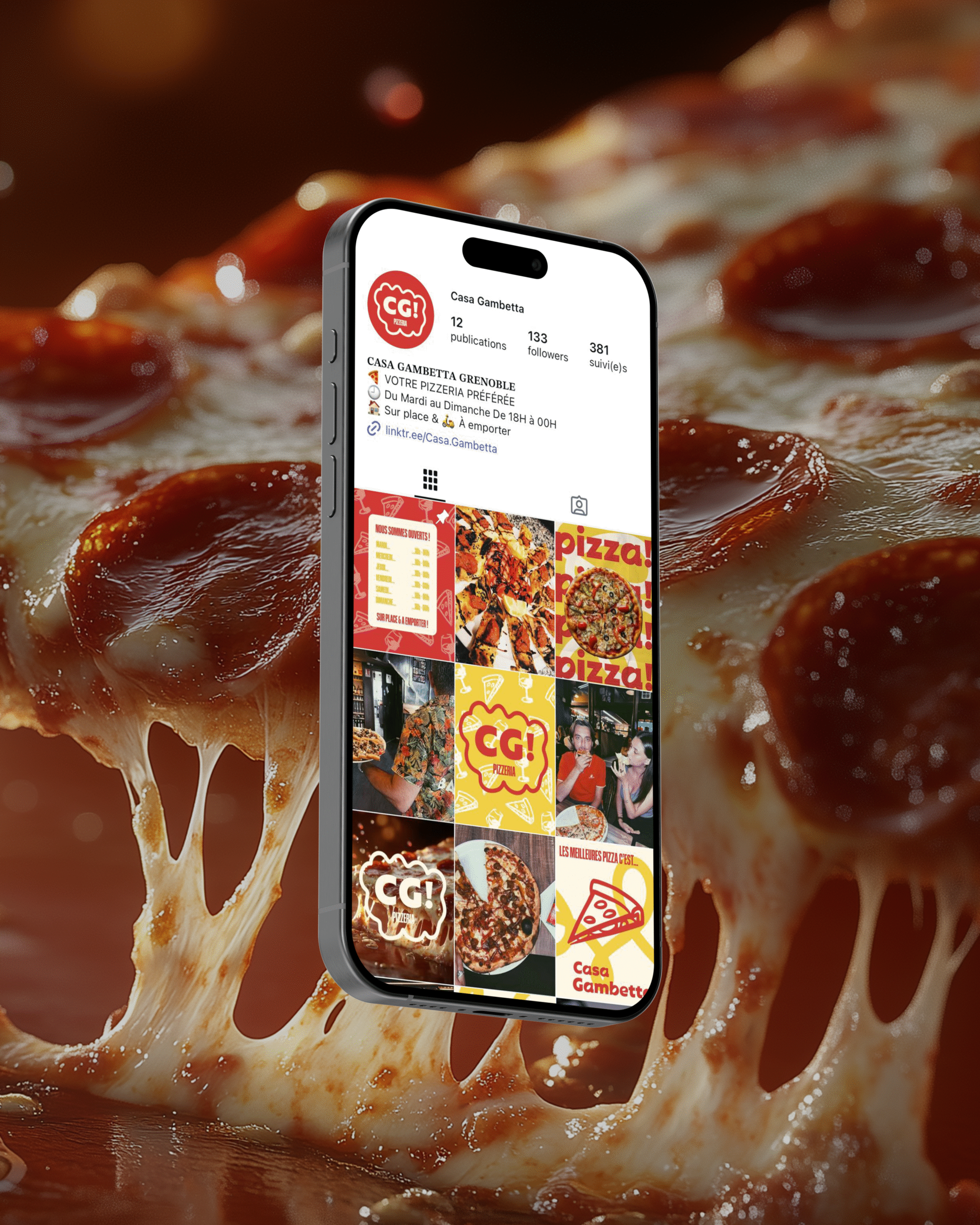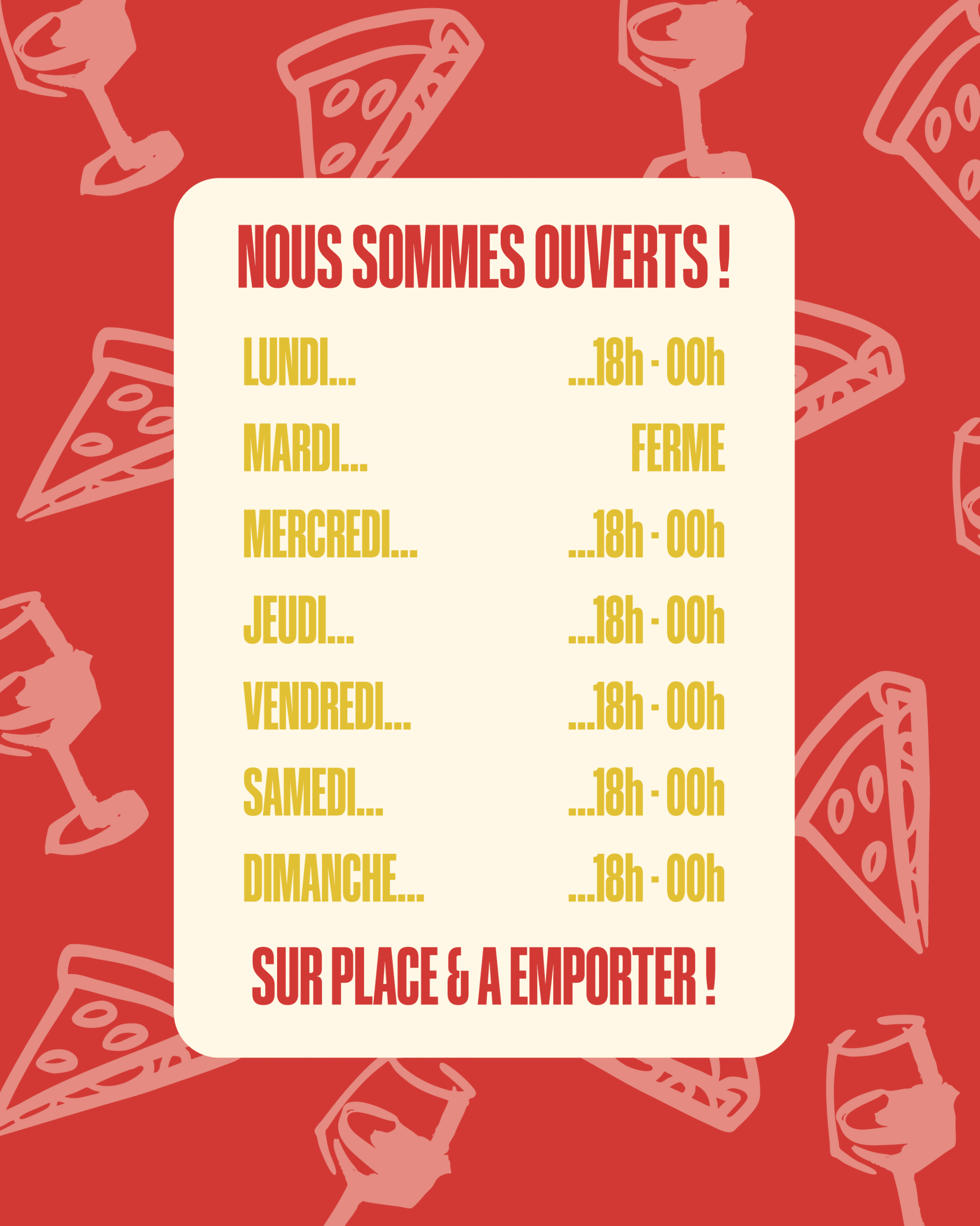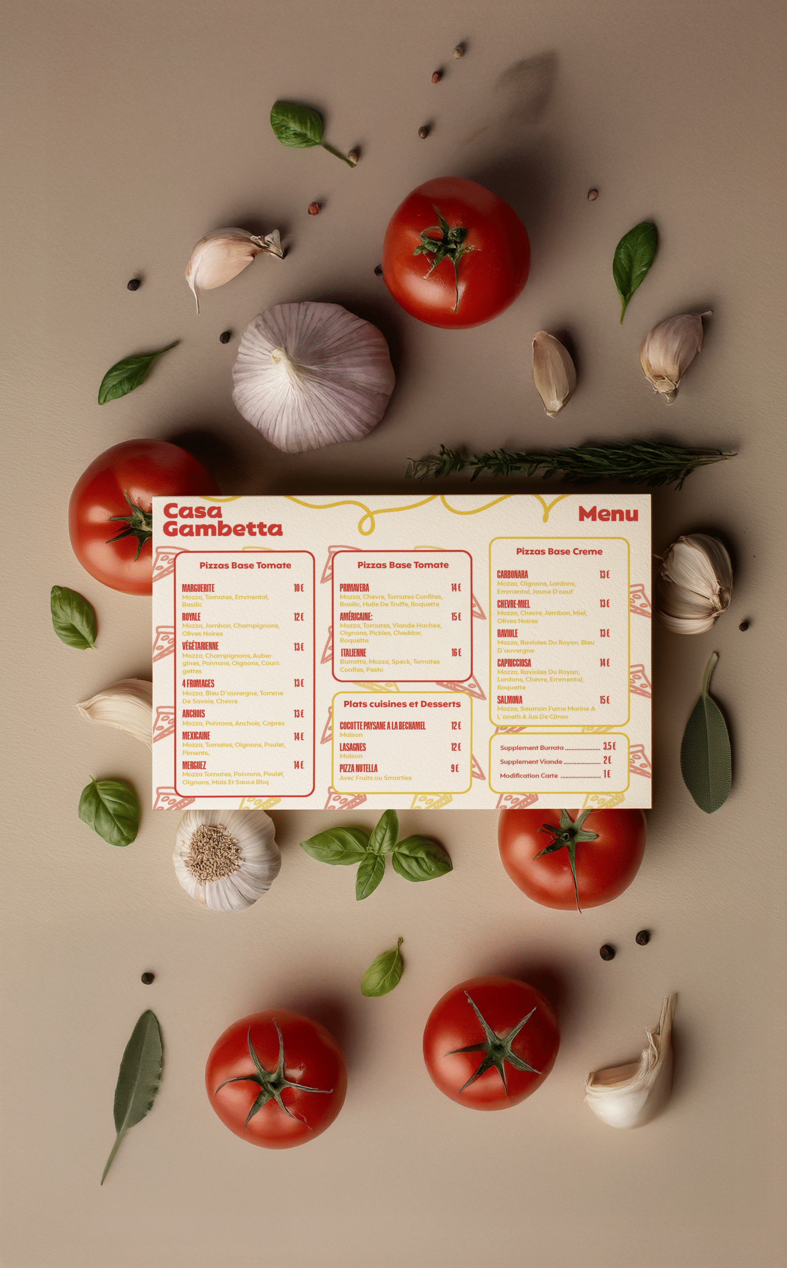 Chaque détail a été pensé pour transmettre cette authenticité : des motifs dessinés à main levée, des typographies expressives et pleines de caractère, une palette de rouges profonds, de beiges doux et de dorés lumineux. Ensemble, ils forment un univers graphique vivant et texturé, qui évoque autant la chaleur du four que le tumulte joyeux d’une soirée entre amis.
